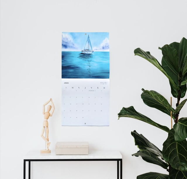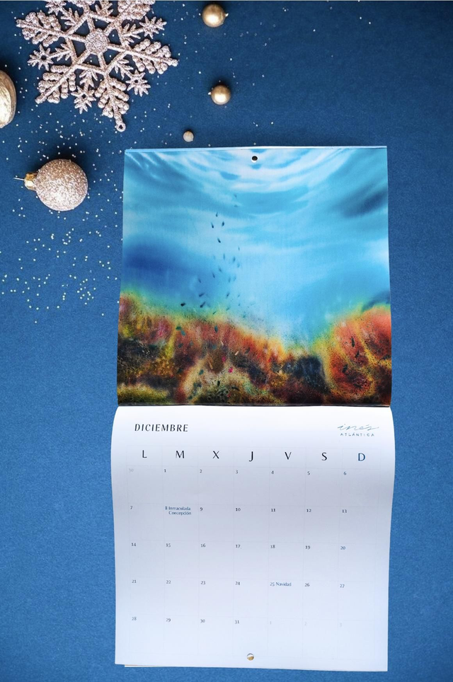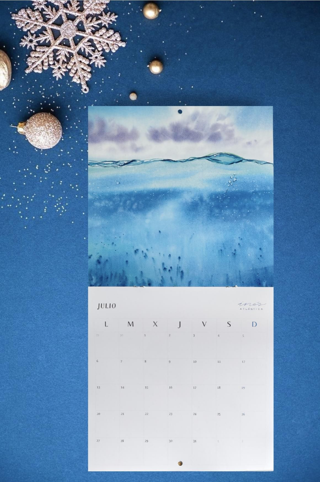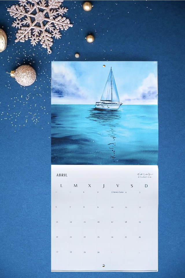 Este calendario ha sido creado completamente desde cero: he escrito y revisado una a una las 365 casillas, y cada mes incluye una acuarela marina seleccionada entre mis obras de 2025 🌊. Cada página corresponde a un mes y cuenta con espacio para anotar tus planes y momentos importantes.