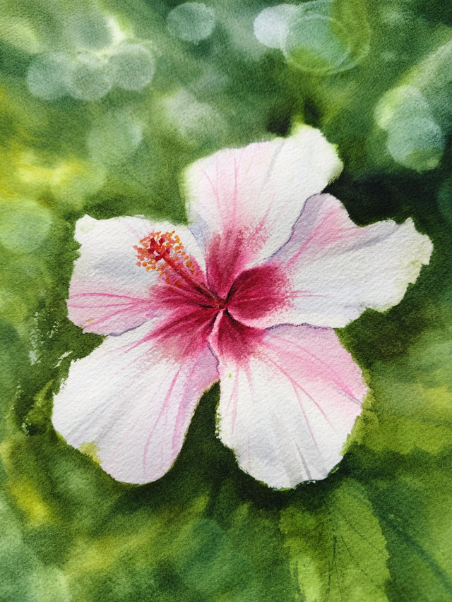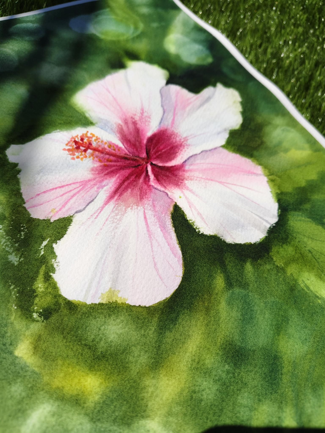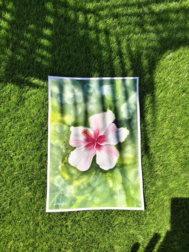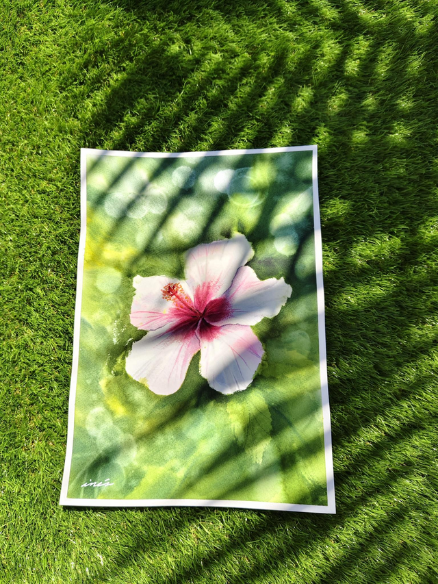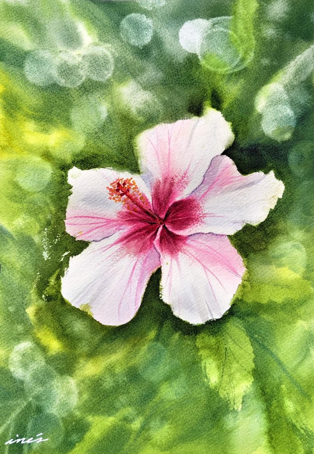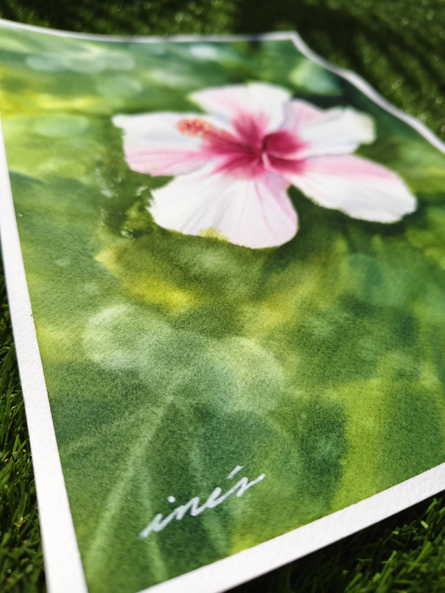 En verano he visitado la preciosa isla de La Palma, allí hice una foto a unas flores de hibiscos enormes que vi paseando. Las flores siempre han sido fuente de inspiración, pero no abundan en mi obra. Esta flor me inspiró tanto que no me resistí a plasmar mi versión en acuarela.