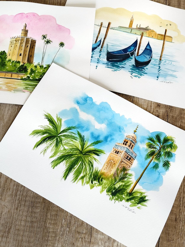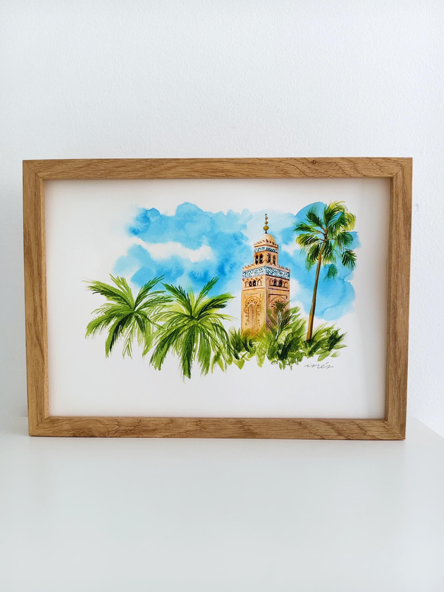 Esta ciudad marroquí famosa por sus palacios, jardines, mercados y mezquitas. En la acuarela me inspiré en el minarete de la Mezquita de Koutoubia, la más grande de Marrakech.